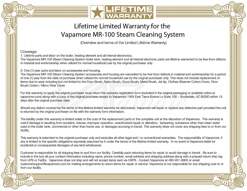 The Vapamore Primo steam cleaner comes with a Lifetime Limited Warranty. Click the link for further details or see below to print off the warranty form.